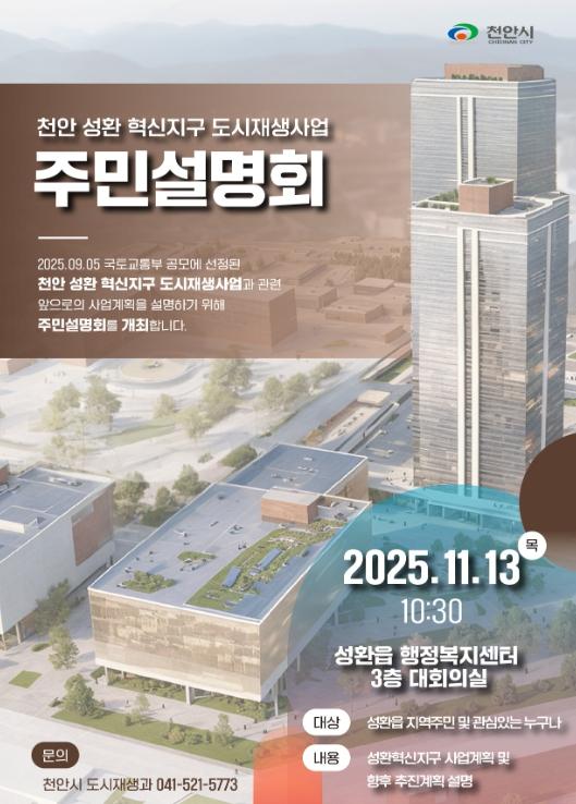 천안시는 오는 13일 성환읍 행정복지센터에서 ‘천안 성환 혁신지구 도시재생사업 주민설명회’를 개최한다.