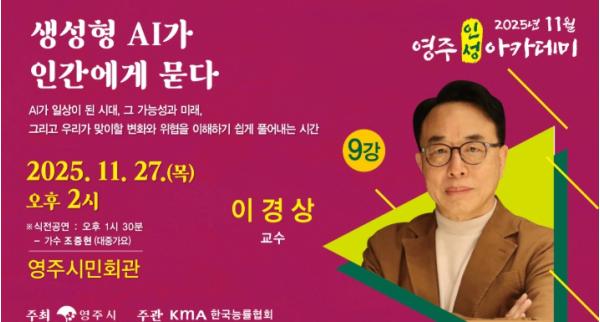 영주시는 오는 27일 오후 2시, 영주시민회관에서 KAIST 이경상 교수를 초청해 ‘11월 영주인성아카데미’를 개최다고 밝혔다.
