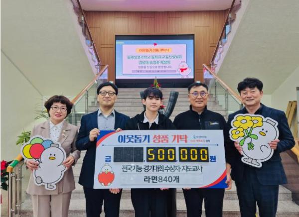 김해시는 2일 전국기능경기대회 수상자와 지도교사가 수상을 기념해 라면 840개(50만원 상당)를 기탁했다고 밝혔다.