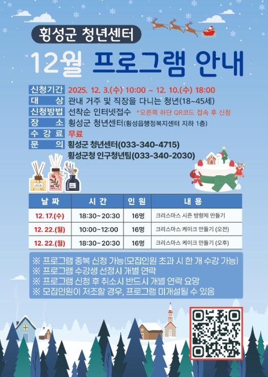 횡성군은 3일부터 10일까지 8일간 청년센터 12월 프로그램 수강생을 모집한다. 이번 프로그램은 지역 청년들이 일상에서 새로운 경험을 쌓고 문화 활동에 참여할 수 있도록 마련됐다.