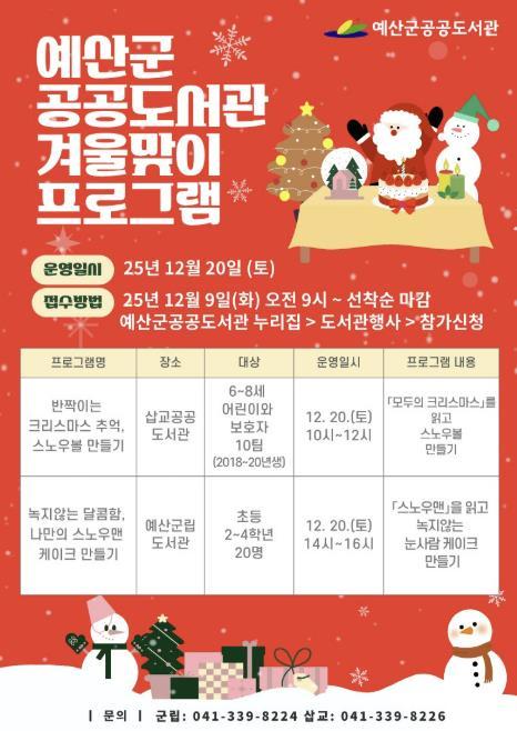 예산군 공공도서관은 겨울철을 맞아 오는 12월 20일 어린이와 가족이 함께 참여할 수 있는 ‘겨울맞이 크리스마스 체험 프로그램’을 운영한다.