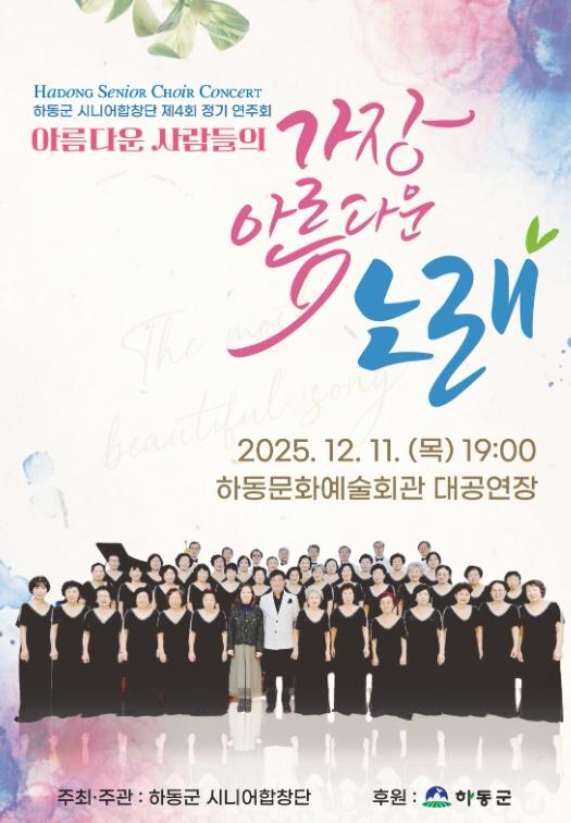 하동군시니어합창단(단장 강용기)이 오는 12월 11일 저녁 7시, 하동문화예술회관에서 ‘제4회 정기 연주회’를 개최한다.