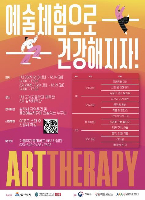 삼척시는 가톨릭관동대학교 RISE 사업단과 협력하여 지역 자연자원을 활용한 ‘융합예술치유 프로그램’을 오는 12월 도계고등학교 체육관과 삼척체육관에서 개최한다.