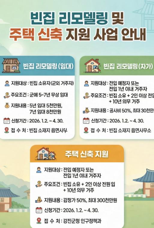 자세한 내용은 강진군청 인구정책과 주거지원팀 또는 각 읍·면사무소로 문의하면 된다.