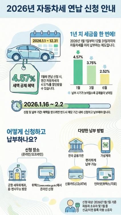 자동차세는 매년 6월과 12월 두 차례 부과되는데, 1월에 연납하면 연세액의 4.57%를 공제받을 수 있다.