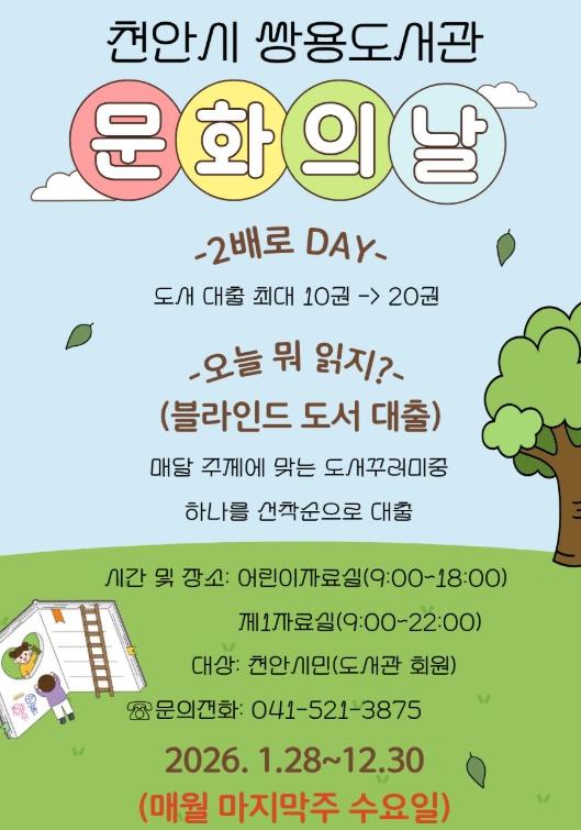 천안시 쌍용도서관은 매달 마지막주 수요일 ‘2026 문화가 있는 날’ 행사를 운영한다고 16일 밝혔다.