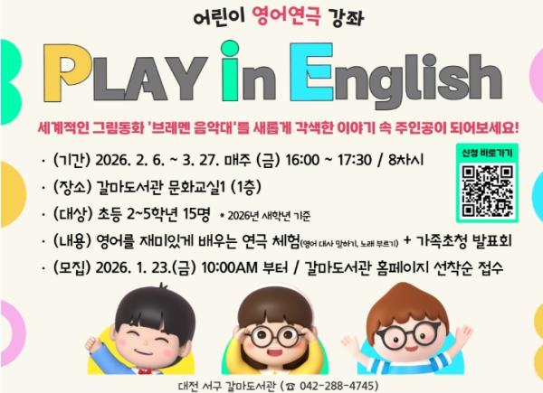대전 서구 갈마도서관은 관내 2~5학년 초등학생을 대상으로 영어 연극 강좌‘Play in English’를 운영한다고 19일 전했다.