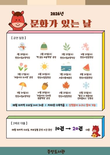 천안시 중앙도서관은 매달 마지막주 수요일 ‘2026 문화가 있는 날’을 운영한다고 19일 밝혔다.