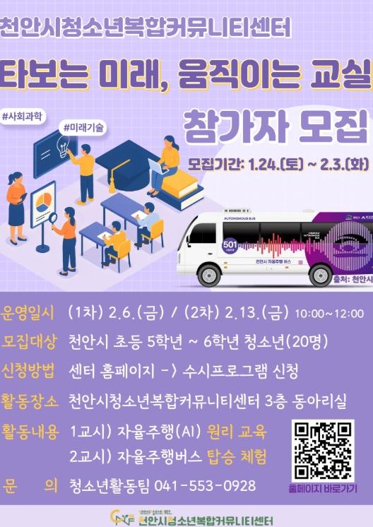 (재)천안시청소년재단 천안시청소년복합커뮤니티센터가 겨울방학을 맞아 자율주행버스를 직접 타보고 미래 기술을 배우는 ‘타보는 미래, 움직이는 교실’ 참가자를 모집한다고 26일 밝혔다.