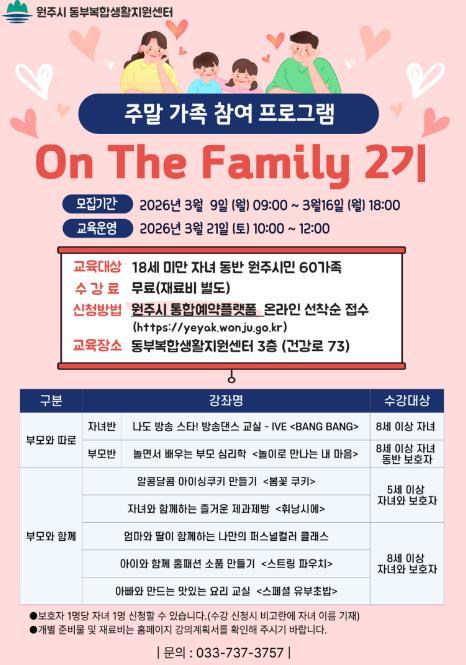 원주시 동부복합생활지원센터는 오는 21일 주말 가족 참여 프로그램 ‘온 더 패밀리(On The Family)’ 2기 과정을 운영한다.