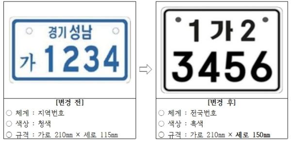 이에 따라 기존 지역번호 체계는 전국번호 체계로 전환하고, 이륜자동차 번호판 규격은 기존 21㎝×11.5㎝(청색)에서 21㎝×15㎝(흑색)로 확대한다. 세로 길이가 3.5㎝ 늘어나면서 원거리에서도 번호 식별이 보다 쉬워질 것으로 전망된다.