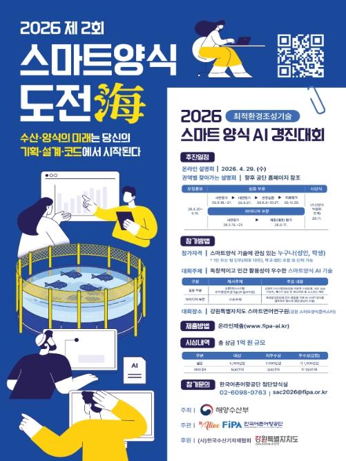 해양수산부와 한국어촌어항공단(이사장 홍종욱)은 4월 20일부터 5월 15일까지 ‘제2회 스마트양식 도전해(海) 경진대회’의 공모를 실시한다고 밝혔다.