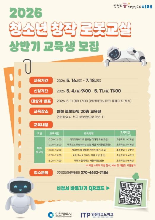 인천테크노파크(인천TP)는 인천 관내 초등학생을 대상으로 로봇과 인공지능(AI)기술을 직접 체험하는 ‘2026년 청소년 창작 로봇교실’ 상반기 교육생을 5월 11일까지 모집한다고 밝혔다.