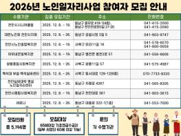 천안시는 ‘내년도 노인일자리 및 사회활동지원사업’ 참여자를 모집한다고 8일 밝혔다. 시는 어르신의 소득 보충과 사회참여 기회 확대를 위해 일자리와 사회활동을 지원하고 있다. 모집규모는 5,194명으