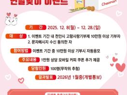 천안시는 오는 28일까지 ‘고향사랑기부제 연말맞이 이벤트’를 진행한다고 8일 밝혔다. 이벤트 기간동안 고향사랑e음 누리집을 통해 천안시에 10만 원 이상 기부하고, 문자메시지 수신에 동의하면 자동 응