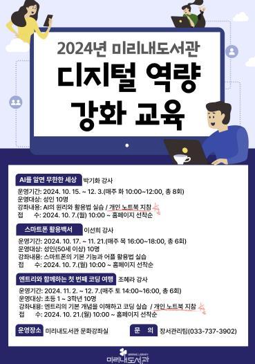 원주시 미리내도서관은 과학기술정보통신부가 주관하고 한국지능정보사회진흥원에서 추진하는 ‘디지털 역량 강화 교육’ 사업을 운영한다.