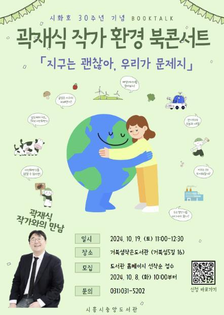 시흥시중앙도서관은 10월 19일 오전 11시, 거북섬 작은도서관에서 2024년 환경 분야 특별한 시흥 한 책으로 선정된 곽재식 작가의 저서 '지구는 괜찮아, 우리가 문제지'와 함께하는 환경 북 콘서트를 개최한다.