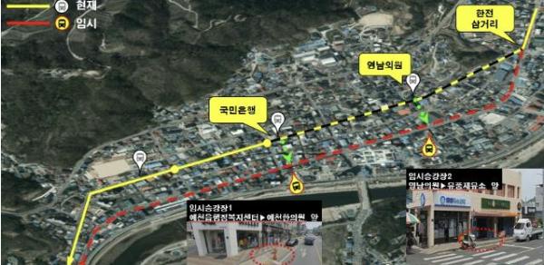 이번 우회 운행으로 차고지를 출발해 효자로를 경유하는 도청신도시(77,88번), 지보, 풍양, 개포, 용궁, 점촌 등 방면 노선버스가 한전삼거리에서 기존 효자로로 운행하는 구간을 시장로로 우회(좌회전)해 예천농협을 거쳐 굴머리 방면으로 운행하게 된다.