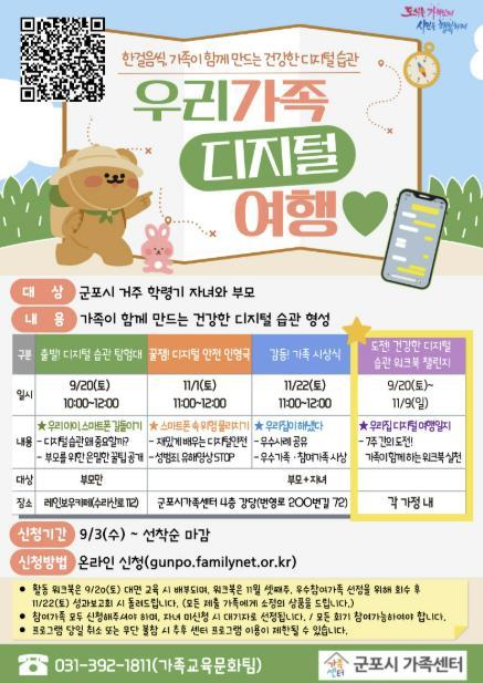 군포시가족센터는 자녀의 스마트폰 사용 습관 형성이 필요한 가족을 대상으로 ‘우리 가족 디지털 여행’프로그램을 오는 9월 20일부터 11월 22일까지 총 4회에 걸쳐 운영한다고 밝혔다.