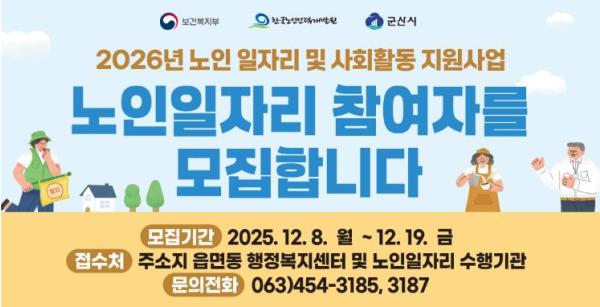 군산시가 어르신들의 활기찬 노후생활과 사회참여 확대, 안정적 소득 확보를 지원하기 위한 '2026년 노인일자리 및 사회활동지원사업'참여자를 8일부터 19일까지 모집한다.