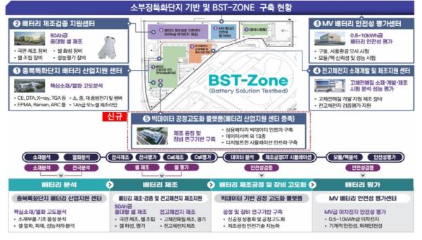 특히, 산업부 공모사업(5개)으로 유치한 이차전지 테스트 인프라를 하나의 지역에 집적화한 BST(Battery Solution Testbed)-ZONE을 구축하여 배터리 소재‧부품 분석, 배터리 셀 제조, 성능평가 등 이차전지 전주기를 지원하고 있다. 이러한 인프라 집적과 지원 체계를 구축한 점이 이번 특화단지 평가에서 높은 점수를 받았다.