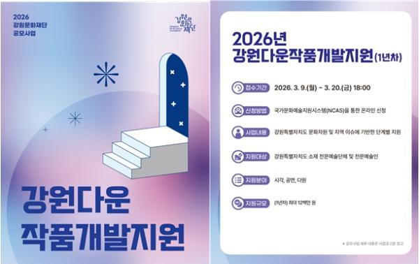 강원문화재단은 강원을 대표할 창작 콘텐츠 발굴을 위해 '2026 강원다운작품개발지원사업(1년차)' 공모 접수를 9일부터 시작한다.