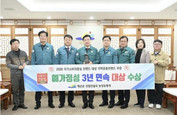 예산군 농특산물 공동브랜드 ‘예가정성’이 브랜드 인지도와 선호도 측면에서 소비자에게 높은 평가를 받아 3년 연속 ‘2026 국가 소비자중심 브랜드(지역공동브랜드 부문) 대상’을 수상했다.