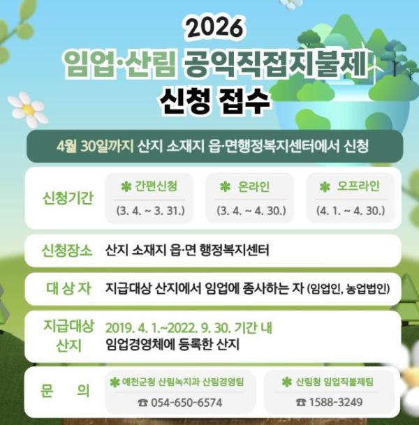 예천군은 임업인의 소득 안정과 산림의 공익기능 증진을 위해 4월 30일까지 ‘2026년 임업·산림 공익직접지불금’ 신청을 받는다.