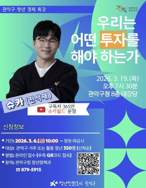 관악구가 오는 3월 19일, 청년들의 경제적 자립을 지원하고 올바른 재테크 가치관 형성을 돕기 위해 인기 경제 유튜버 ‘슈카’를 초청해 특별 강연을 개최한다.