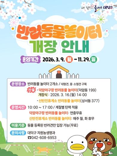 운영 기간은 11월 29일까지이며, 덕암야구장 반려동물 놀이터는 오는 16일 오후 2시에 개장식을 개최할 예정이다.