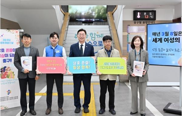 대전 중구는 ‘3.8 세계 여성의 날’을 앞두고 지난 6일 구청 본관 로비에서 노사가 함께 출근하는 직원들을 격려하며 ‘좋은 직장, 서로 존중 캠페인’을 전개했다고 밝혔다.