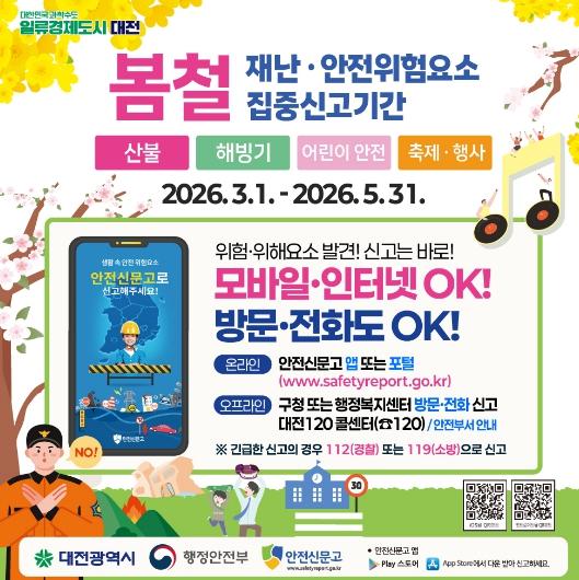 신동헌 시민안전실장은“시민 여러분의 작은 관심과 신고가 더 큰 사고를 예방하고 더욱 안전한 대전을 만드는 힘이 된다”라며 “온라인 신고가 익숙하지 않은 시민들께서도 대전120콜센터나 가까운 행정복지센터 등 오프라인 창구를 통해 안전신고에 적극 참여해 주시길 바란다”라고 말했다.