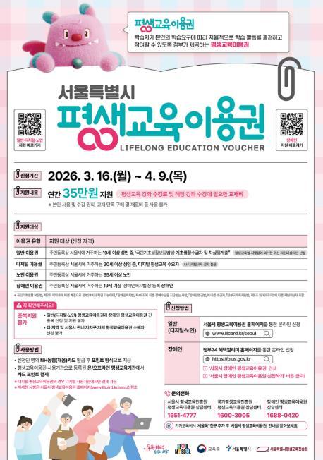 서울 도봉구가 2026년 평생교육이용권 신청자를 4월 9일까지 접수한다.
