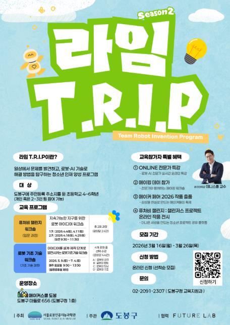 서울 도봉구가 서울로봇인공지능과학관(RAIM)이 주최하는 '2026년 RAIM T.R.I.P(동행 로봇 발명프로그램)' 참여 자치구로 선정됐다고 밝혔다.
