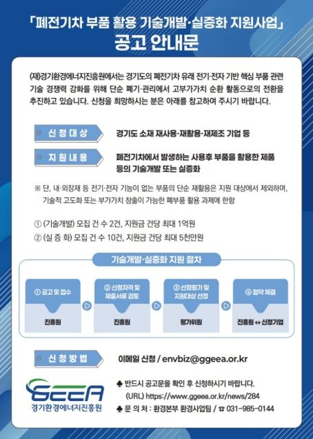 지원 대상은 본사, 공장, 연구소 가운데 1곳 이상이 경기도에 있는 기업이다. 선정된 기업에는 폐전기차 부품을 활용한 재제조·재사용 기술개발과 제품화에 필요한 비용을 지원한다.