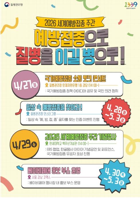 질병관리청은 세계보건기구(WHO)가 정한 세계예방접종주간(매년 4월 마지막 주)을 기념하여 4월 27일부터 5월 3일까지 일주일 동안'2026 예방접종주간행사'를 운영한다.