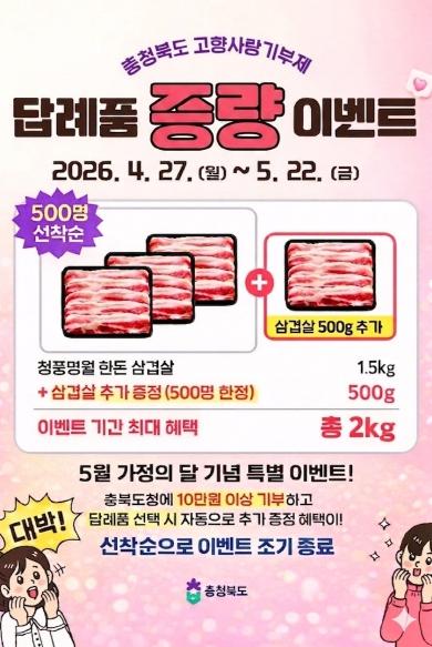 충북도가 가정의 달을 맞아 지역사랑과 나눔 문화를 확산하기 위해 ‘고향사랑기부제’ 답례품인 한돈 증량 이벤트를 4월 27일부터 5월 22일까지 진행한다.