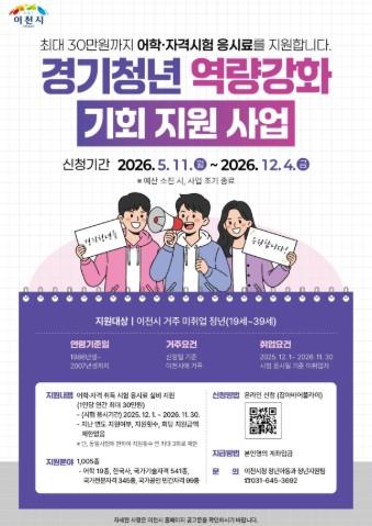 이천시가 오는 5월 11일부터 미취업 청년의 어학·자격시험 응시료를 지원하는 ‘경기청년 역량강화 기회지원 사업’ 대상자 모집에 들어간다.